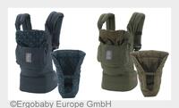 Zwei modische Komforttragen mit stylishem Neugeborenen-Einsatz bellybutton und Ergobaby präsentieren: „Lucky Star Olive“ und „Lucky Star Blue“. (Bildquelle: Ergobaby Europe…