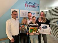 Die Sieger im 4. GrammArt Kunstwettbewerb der Praxis Dr. Grammatidis & Partner aus Kirchheim stehen fest v.l.n.r.: Dr. Grammatidis, Lilli…