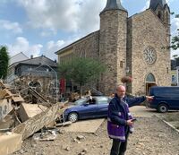 Unterstützung aus der VEM-Gemeinschaft für die diakonische Soforthilfe der EKiR und EKvW hält an Pfarrer Friedemann Bach vor der Martin-Luther-Kirche…