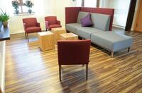 Großer Auftritt für kleine Hotel-Lobby Sofa mit integriertem Raumteiler von Schnieder, dazu Sessel "Eddy" und Loungetische 30739Mit viel Leidenschaft und…