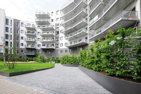 Hochbeete der Firma Richard Brink gliedern Gärten des "Living Circle" Der Wohnkomplex "Living Circle" in Düsseldorf.Runde Konturen sind das Hauptmerkmal…