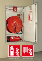 Alarmieren, Evakuieren, Löschen Weiß-rote Brandschutzzeichen weisen auf Feuerlöscher und Wandhydranten hinIm Falle eines Entstehungsbrandes dürfen Feuerlöscher und Wandhydranten von jedem…