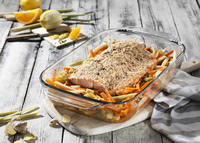 Mit Rezept: Gegrillter Sesamlachs auf Asia-Gemüse Gegrillter Sesam-Lachs auf asiatischem Gemüsebett in der Form Pyrex Optimum (Rezept: Stefan Wiertz)Backen, kaltstellen,…