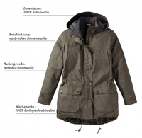 Die Natur zeigt, wie es geht Bienenwachs-Parka von hessnaturEine kräftige, gewachste Oberfläche in olivgrün, verstärkte Nähte, ein hoch schließender Kragen…