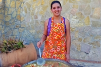 Paellacooking auf der Urlaubsfinca auf Mallorca In Flipflops und Badehose zu Tisch - die Paellaköchin kommt ins Urlaubsdomizil Alcudia Holidays…