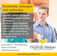 Mehr als 80 % aller Erwachsenen leiden laut Experten unter behandlungsbedürftigen Zahnfleischentzündungen. Parodontitis, Parodontose-Behandlung Zahnarztpraxis Dr. Weber in Weinsberg"Volksleiden" Parodontitis…